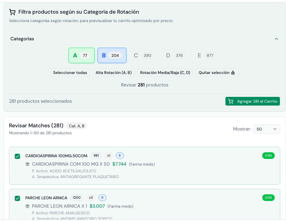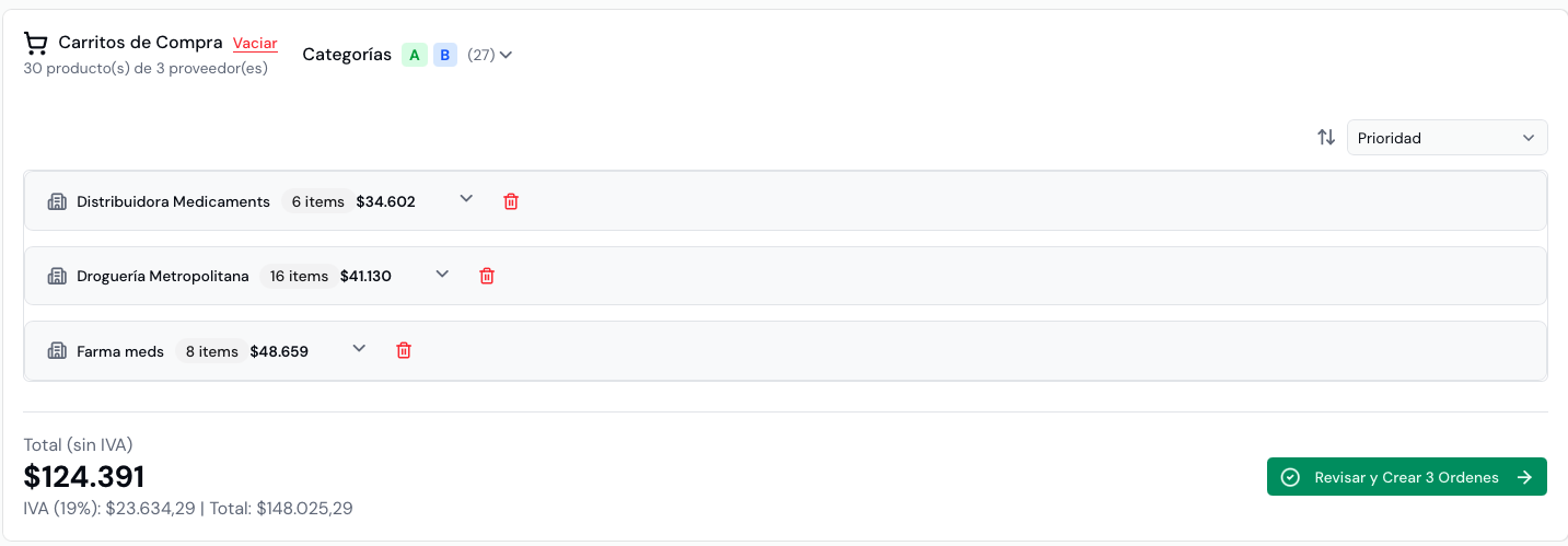 Genera automáticamente carritos de compra por proveedor según criterios de precio, disponibilidad y vencimiento, optimizando costos y reduciendo quiebres.